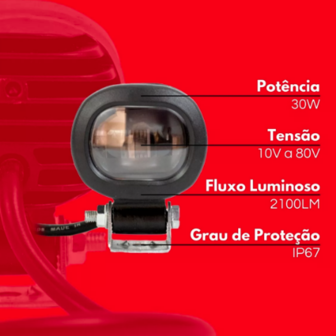 Potência 30W / Tensão 10-80 V/ Fluxo Luminoso 2100LM /Grau de Proteção: IP 67